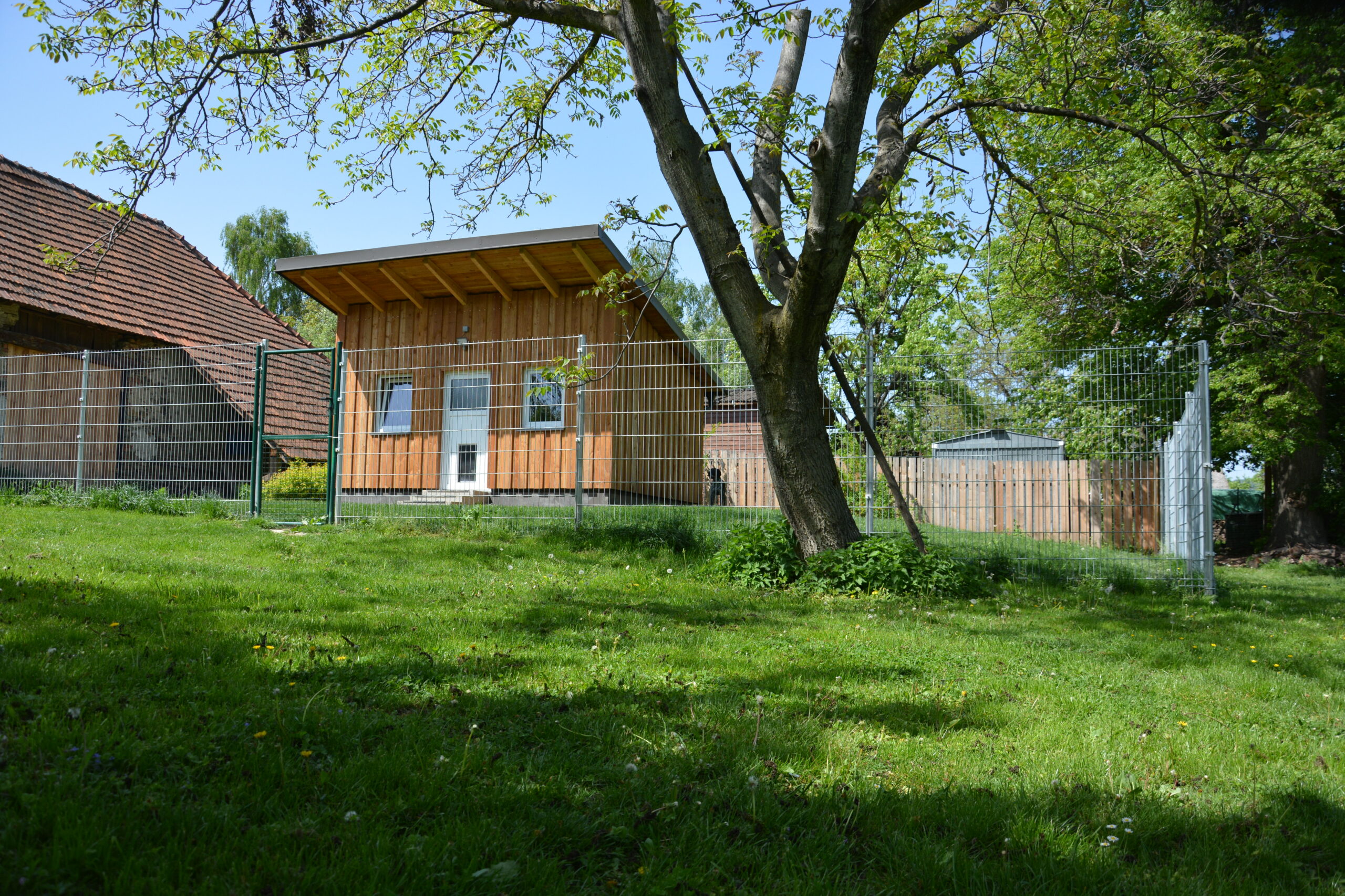 Unser Hundehaus ist der Startpunkt für unsere Pflegehunde, die neu in die WG kommen. Deshalb haben wir es möglichst gemütlich und sicher für unsere Neuankömmlinge gestaltet. Der eigene Auslauf zum Hundehaus umfasst 400m². Unsere Gesamtgrundstück umfasst 6000m². Das gesamte Grundstück ist umzäunt und dient so als Spiel- und Laufwiese für unsere WG Hunde. Für uns ist es einfach wichtig, dass die Hunde glücklich sind.
